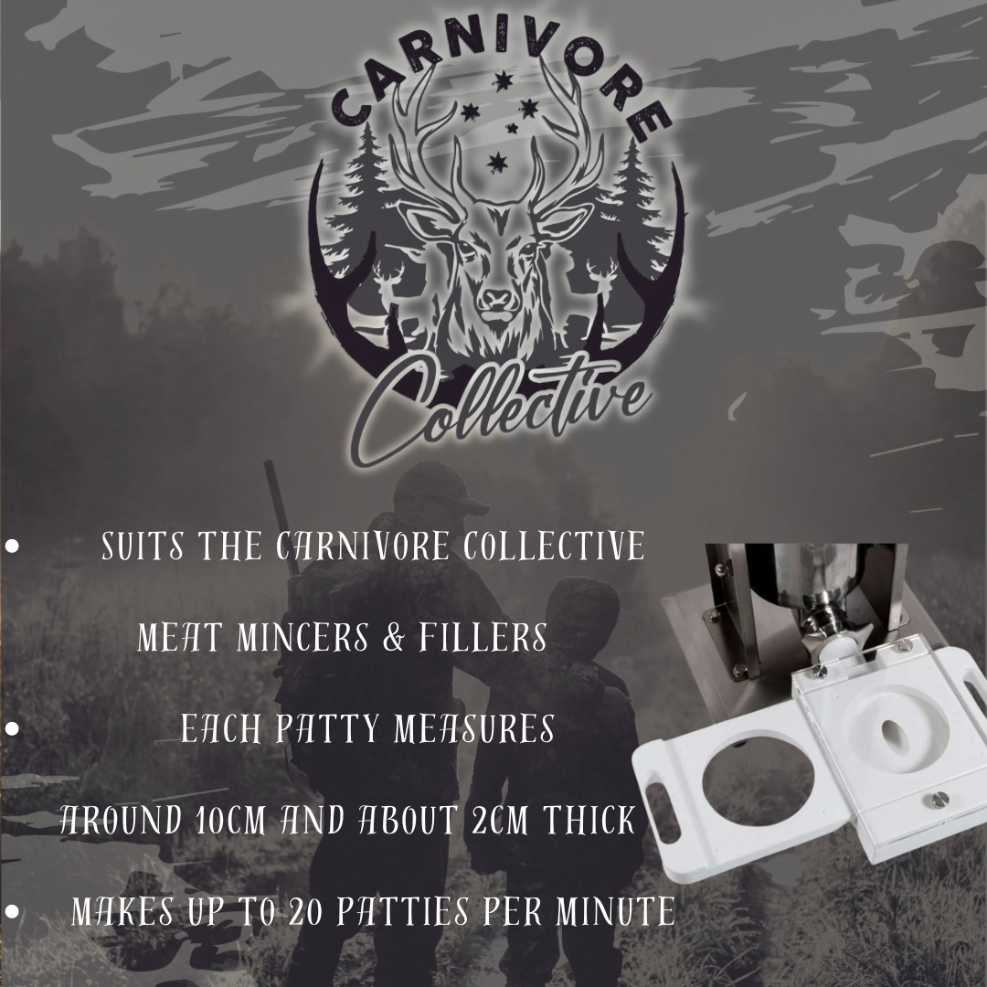 The Carnivore Collective Hamburger Attachment creates the perfect burger quickly and easily. All burgers are made to the same size so they can be cooked evenly. This attachment can be attached to the Carnivore Collective sausage fillers.
