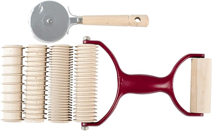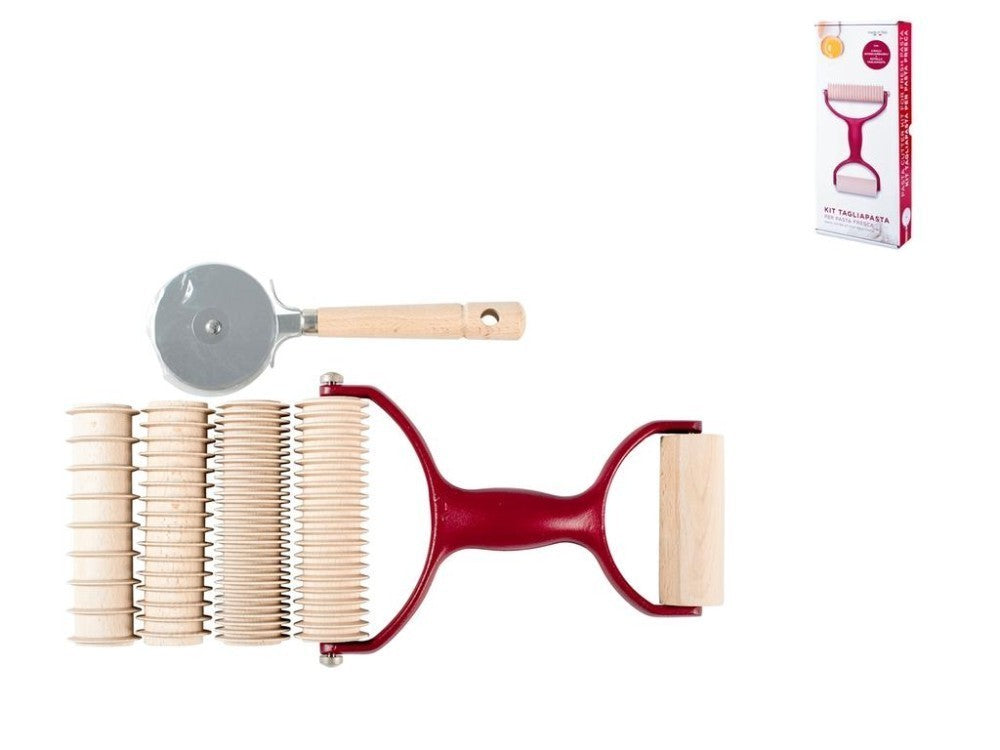Pasta cutter with cast/enameled aluminum handle, equipped with 5 rolls in beech wood: 4 interchangeable rollers prefabrication spaghetti, pasta, fetuccine and pappardelle; 1 fixed roll to place the noodle cutter with flat stainless steel blade and wooden handle.Β