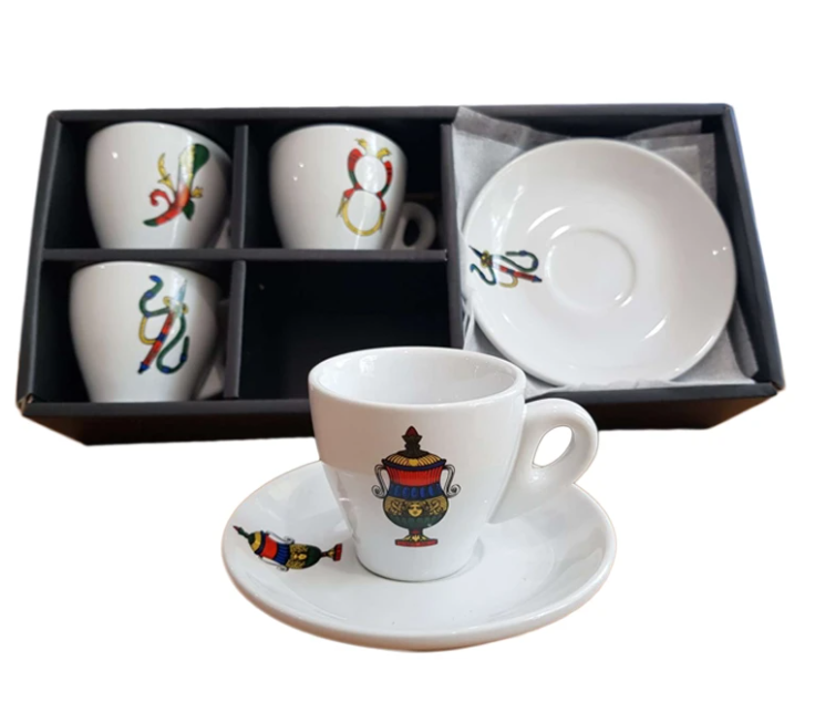 Impress your guests with this set of 4 espresso cups and saucers featuring traditional Italian playing card designs. These heavy white porcelain cups are not only stylish but also durable. Perfect for espresso lovers looking to add some cultural flair to their coffee routine.
