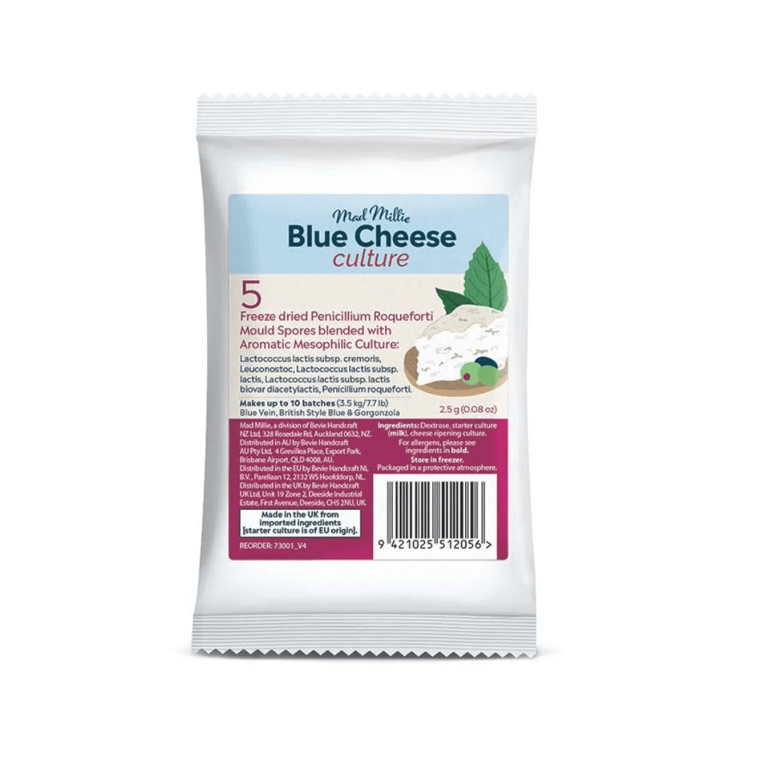 You no longer need to buy Penicillum Roqueforti and Aromatic Mesophilic separately. This Mad Millie blue mould cheese culture is a freeze dried mixed blend culture containing both Penicillium Roqueforti and Aromatic Mesophilic.