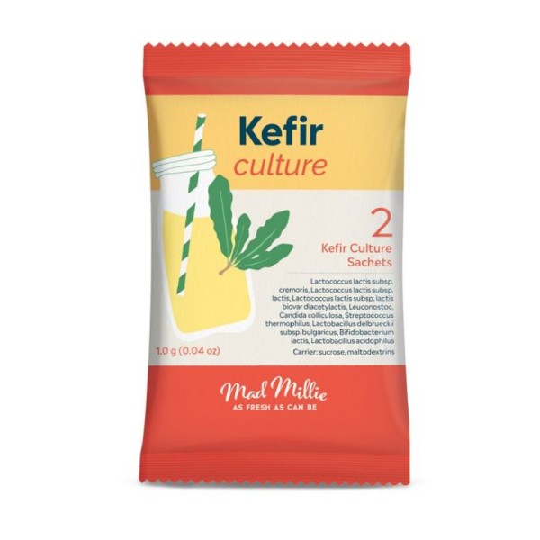 Kefir is a popular and delicious fermented drink, using bacteria and yeast, which is healthy and great for you. Mad Millie Kefir Culture contains 7 bacteria strains and 1 yeast strain. Pack contains 2 sachets. Contains: milk/dairy Each sachet can be used for culturing 1 L of milk, soy milk, juice or coconut water. Each sachet can be recultured (see kit instructions) up to 2 times.