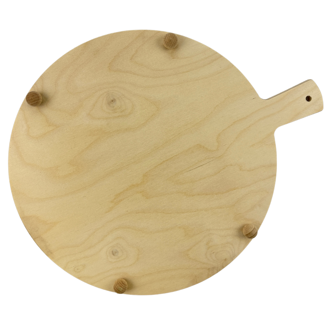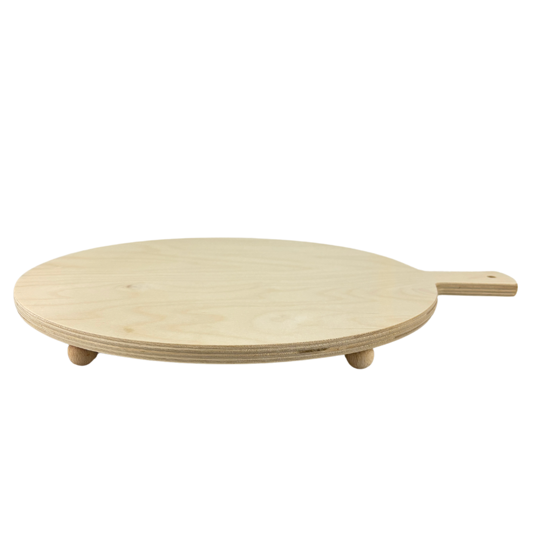 The Round Wooden Paddle with 4 Feet is crafted from high-quality light-colored wood and designed with a diameter of 35 cm. Elevated on four sturdy feet, this paddle provides an attractive, stable platform for serving pizza, cakes, polenta, and cheese.