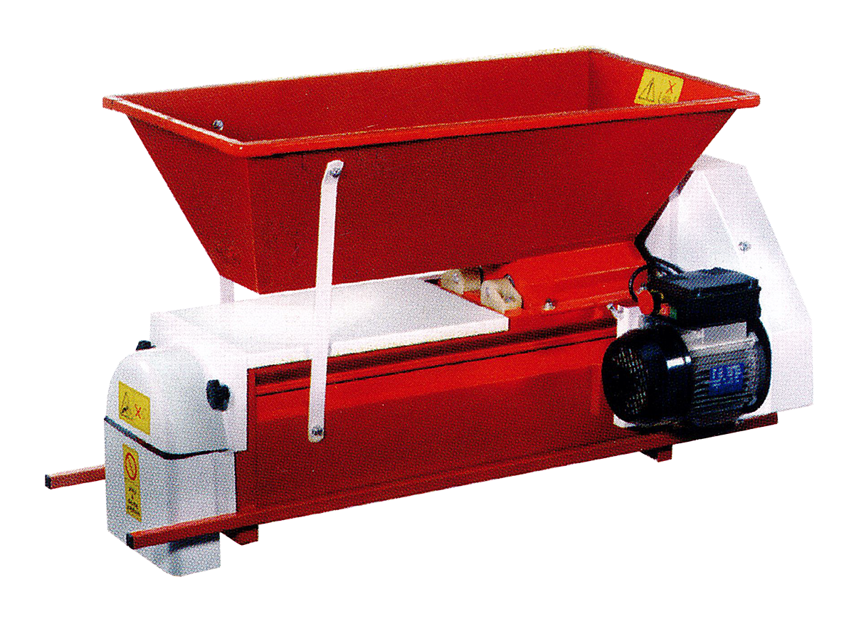 Italian Electric Crusher Destemmer with 80L baked enamel hopper and nylon rollers. Capable of processing up to 1000-1500kg per hour.