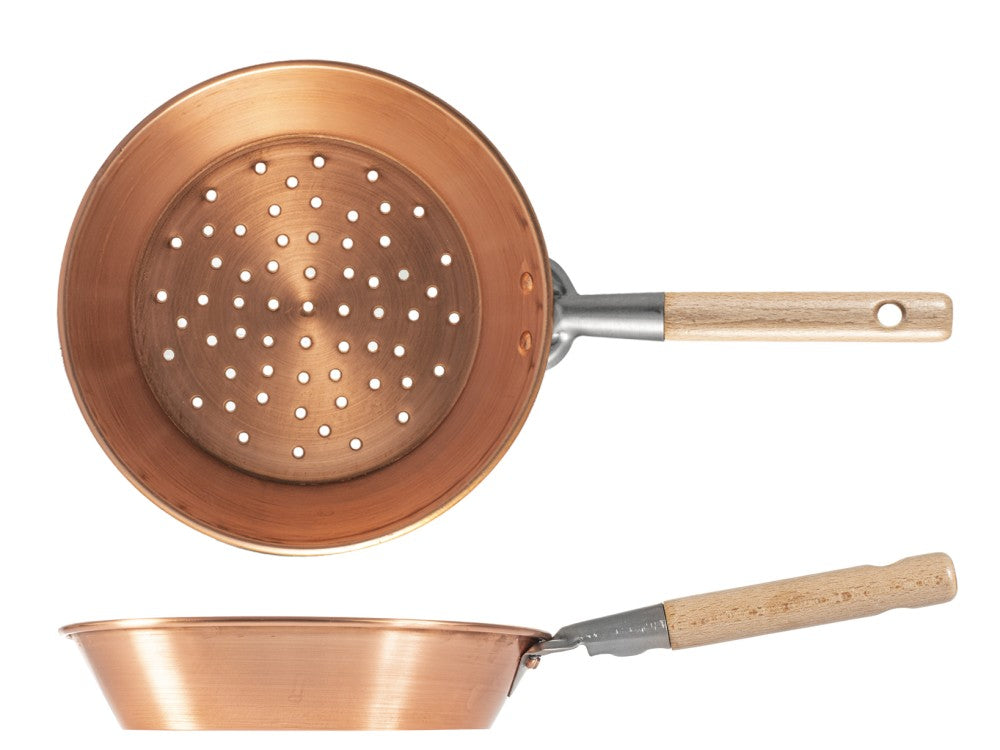 Roast chestnuts to perfection with this traditional 27cm roasting pan, featuring a perforated copper metal base that allows heat to circulate evenly for consistent results. The sturdy wood handle stays cool during cooking, providing comfortable grip and control. Ideal for holiday gatherings and festive celebrations, this artisan-crafted pan combines functionality with timeless appeal. Perfect for both home cooks and culinary enthusiasts seeking authentic roasting equipment.