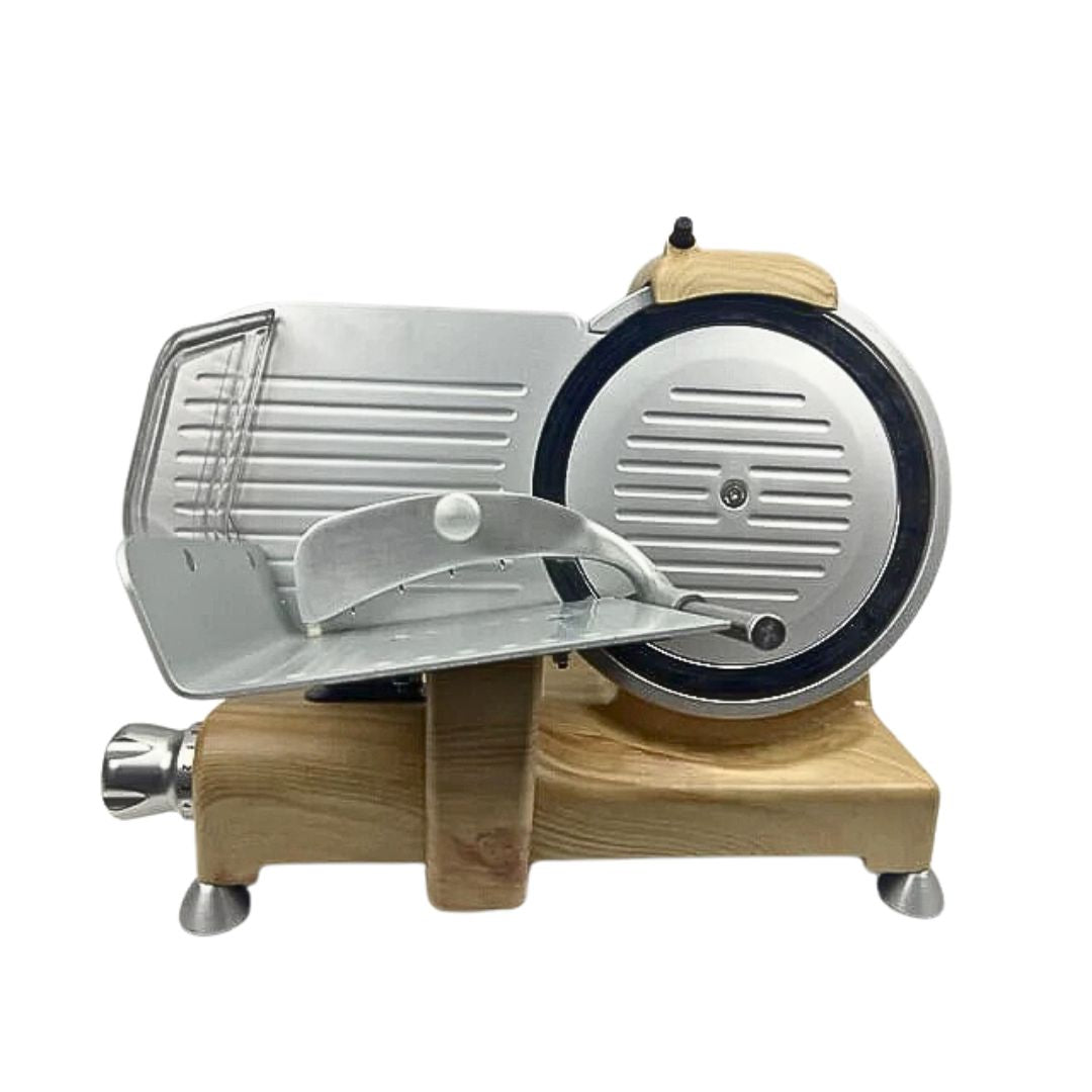 The LUXURY 250 Wood Grain Edition is a stylish and efficient household meat slicer designed to slice cold cuts, cheeses, bread, fish, fruits, and vegetables. Featuring a professional third-generation blade for enhanced durability and cutting efficiency, this slicer is designed with precision and ease of use in mind. The innovative easy clean system allows the meat plate to be tilted for effortless cleaning, and the removable food holder arm with a finger protection guard is dishwasher-safe for added convenience. This slicer is a great addition to any kitchen, combining high performance with modern design.