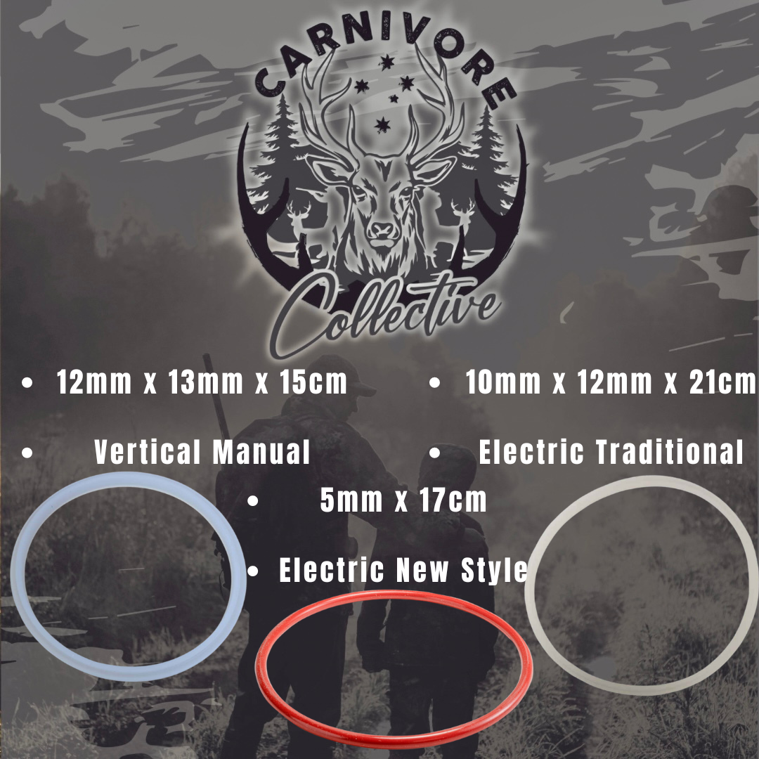 Our Carnivore Collective Vertical Sausage Filler Plunger Seals suit most vertical 5l & 7l manual fillers and 10l & 15l electric fillers that feature stainless steel hoppers and pistons (plungers). The Plunger Seals are available in three different sizes.